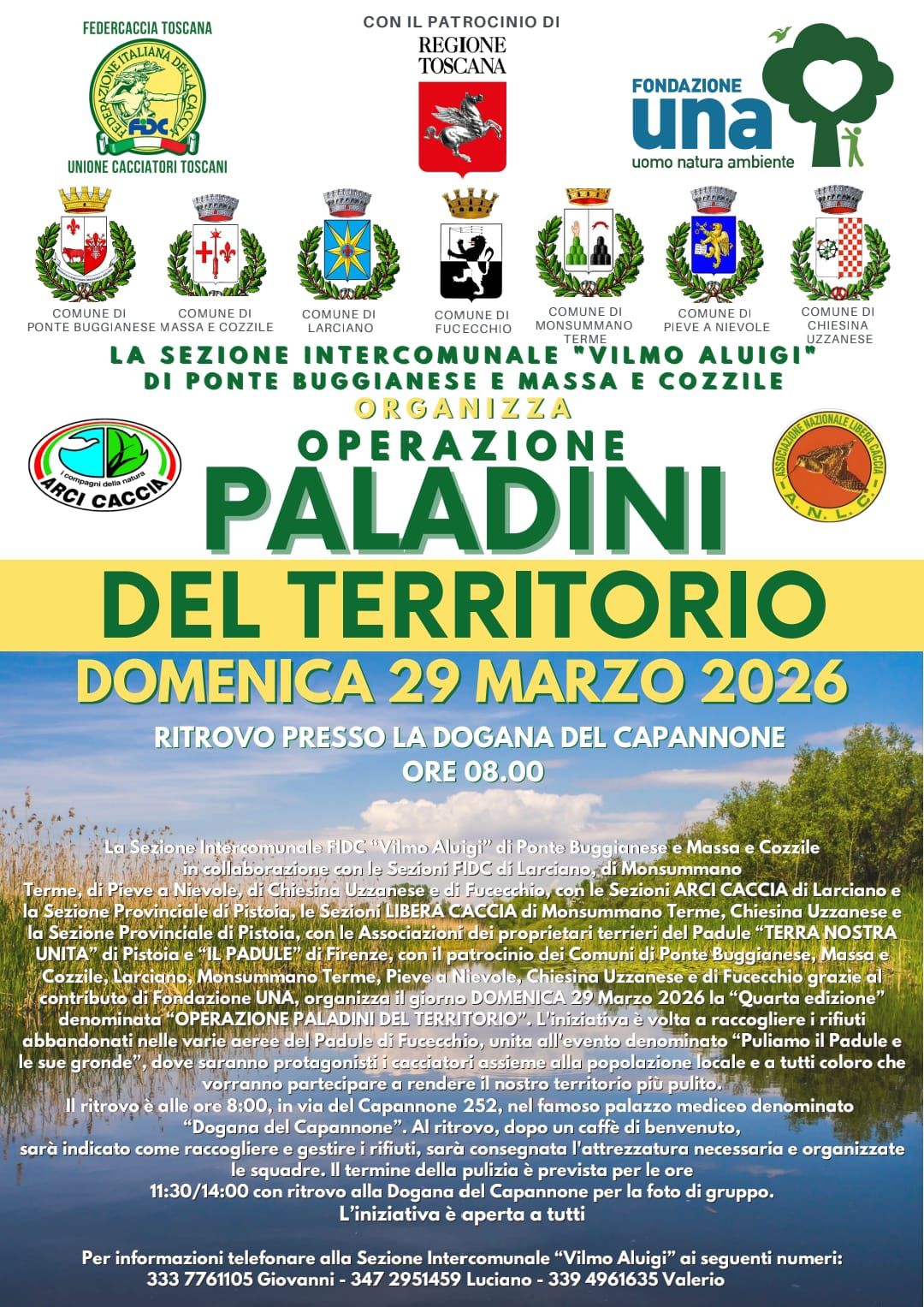 L’iniziativa è finalizzata alla raccolta dei rifiuti abbandonati nelle aree del Padule di Fucecchio e vede protagonisti cacciatori e cittadini volontari che desiderano contribuire attivamente alla tutela del proprio territorio.
